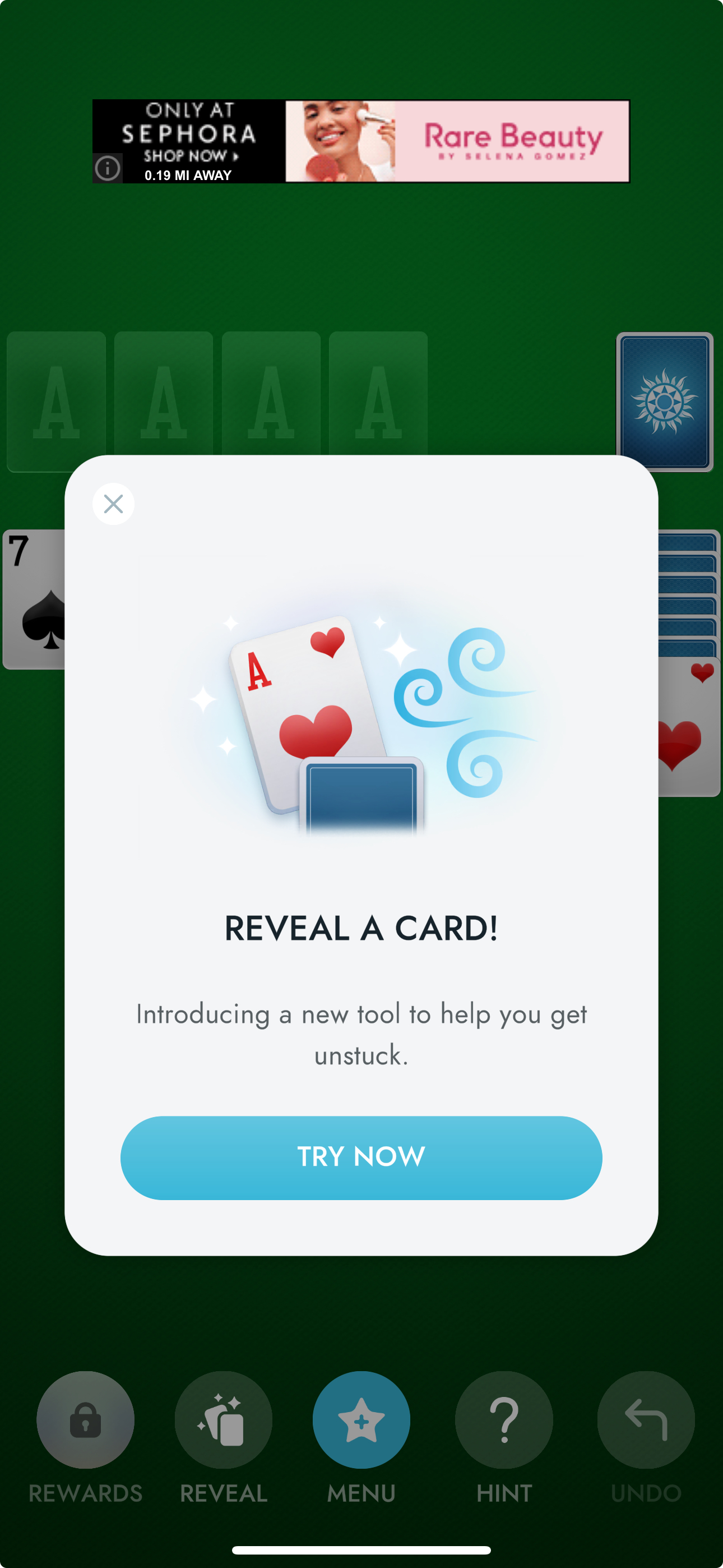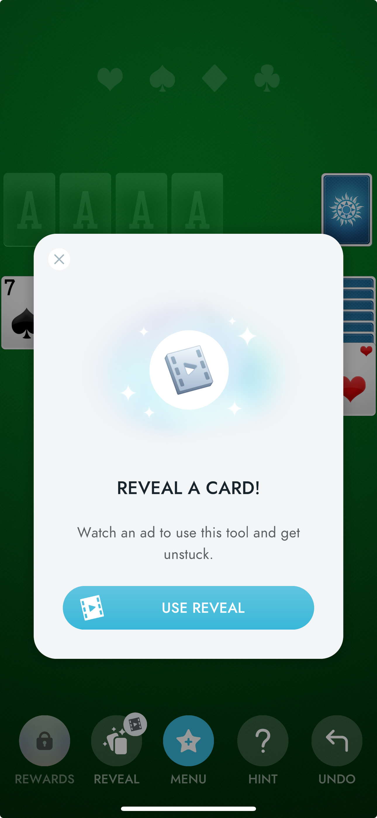 As part of an effort to enhance the core game loop in Solitaire and integrate rewarded video more meaningfully, I led the product strategy for the Reveal feature — an in-game assist designed to support players during moments of friction while introducing a monetizable mechanic aligned with gameplay. Inspired by similar “Magic Wand” features seen in other casual games, Reveal unveils a helpful card on the board through a wind animation, allowing players to continue a stalled game.
