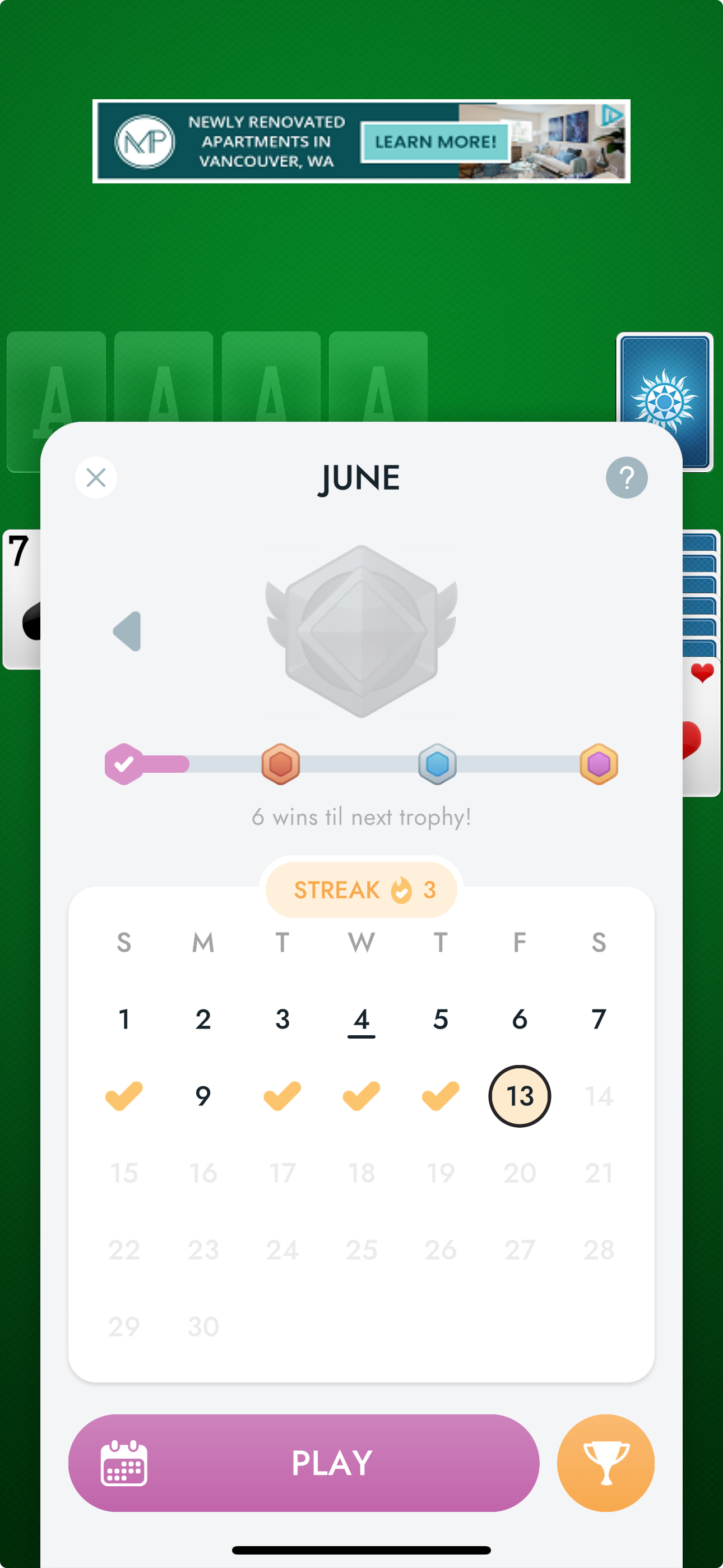 To support long-term engagement and incentivize players to return to the app each day, I led the strategic development of the Daily Calendar — a Daily Game mode designed to encourage players to participate in daily Solitaire play. I partnered closely with design, engineering, and business intelligence to shape feature goals, design A/B tests, and determine optimal rewarded video engagement opportunities that aligned with both player motivations and monetization objectives.