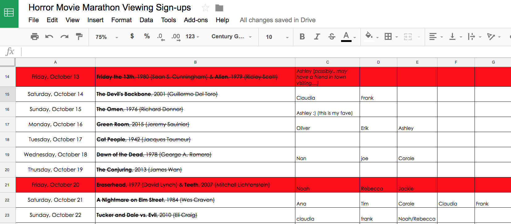 Caveats: Include a broad range of films from horror sub-genres (i.e. body horror, zombies, vampires, and psychological horror) and over the course of the genre’s history. No decade of film can be repeated back-to-back.