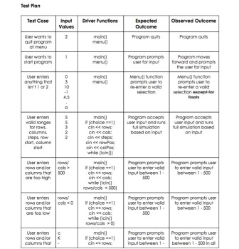 Program menu prints to the screen at the start to prompt user to select number of rows and columns for a dynamically allocated array, the start position (row/col) of the ant, and the number of steps for the simulation to run.
