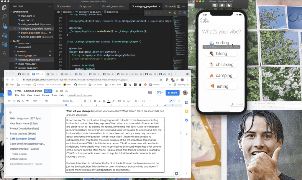 Here you can see an iPhone Simulator displaying Salty upon app open (as well as course documentation and some code snippets). Tooltips are highlighted in this screenshot as they were a later feature addition to buttons in order to eliminate any possible confusion for new users and enable those on e-readers to access the app more readily: