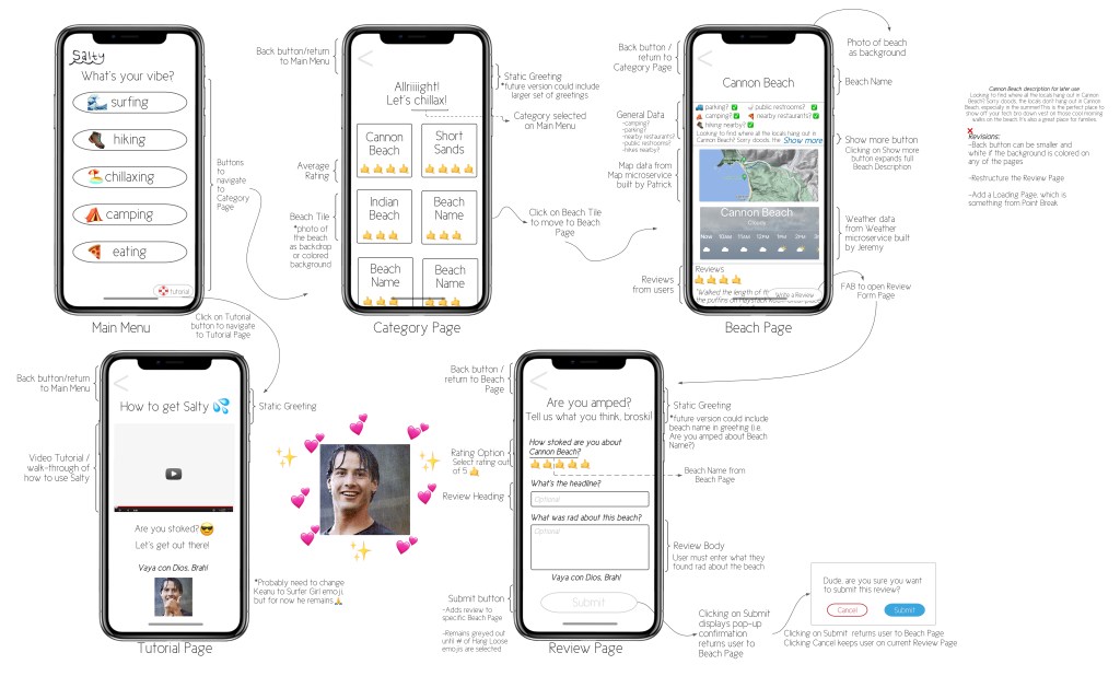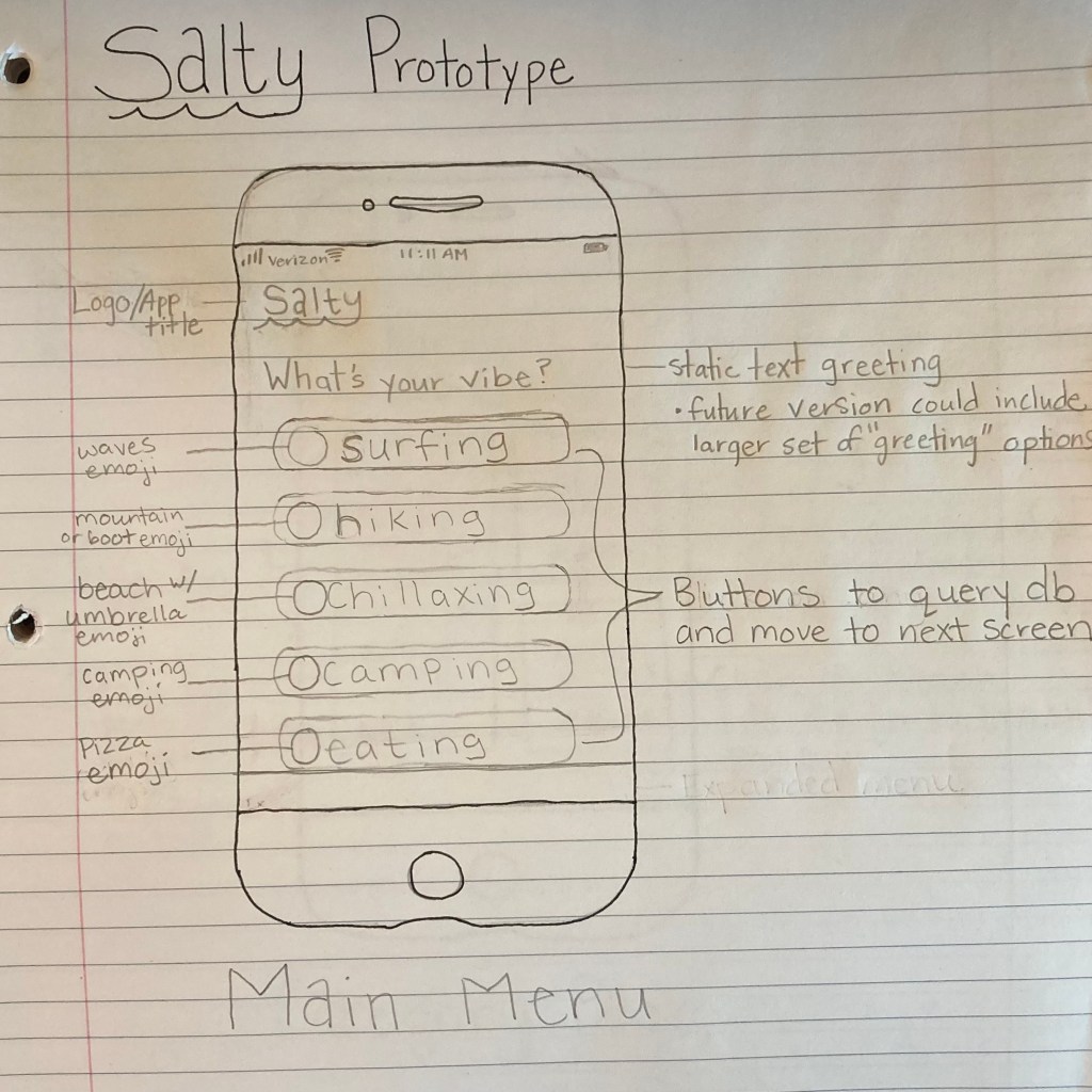 Salty is intended to be a kitschy, Point Break obsessed application that serves as a single space for getting information (e.g. weather, location map, surf potential, nearby points of interest, restaurants, etc.) about a beach locale. A la Kook of the Day, Salty utilizes surf slang to create a user experience that is fun and loose, and hopefully induces laughter and joy.