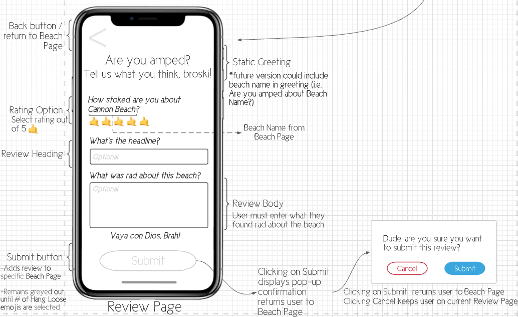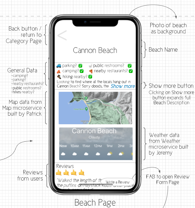 The graphical user interface for Salty is very clean and influenced by other popular apps like AllTrails (with the snapshot/General Data at the top), Gmail (with its clean UI and floating action buttons), and Instagram. The back button matches what’s on nearly every app; the Write a Review button matches the Compose button in Gmail, and the Beach Tiles for navigating to a specific Beach Page matches the UI on AllTrails, Yelp, DoorDash, and countless other apps. Having these familiar UI features will hopefully make the app an immediately comfortable space for new users. The use of emojis is also obviously popular, familiar, and fun, so seeing these in buttons and for review ratings will, ideally, make users feel laidback.